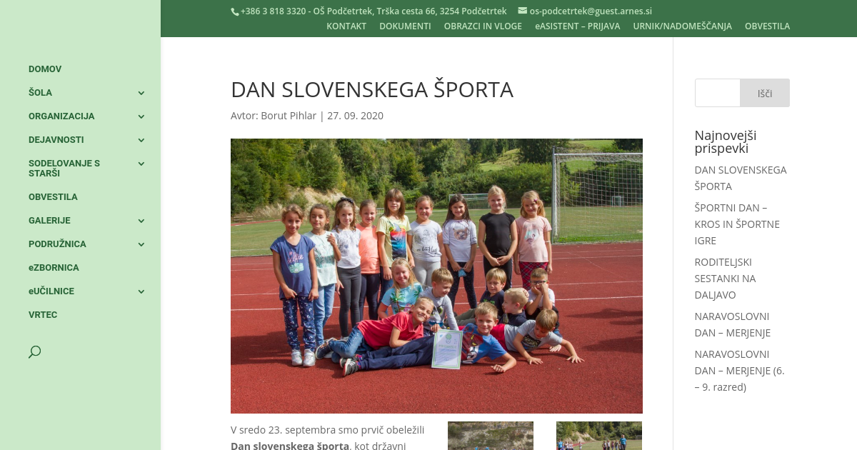 V sredo 23. septembra smo prvič obeležili Dan slovenskega športa, kot državni praznik. Na naši šoli smo na ta dan organizirali že tradicionalni Množični tek otrok pod pokroviteljstvom Atletske zveze Slovenije. Sodelovalo je 105 učencev in učenk od 1. do 5. razreda. Naslednji dan v četrtek 24. 9. pa smo izvedli športni dan še za učence od 6. do 9. razreda.