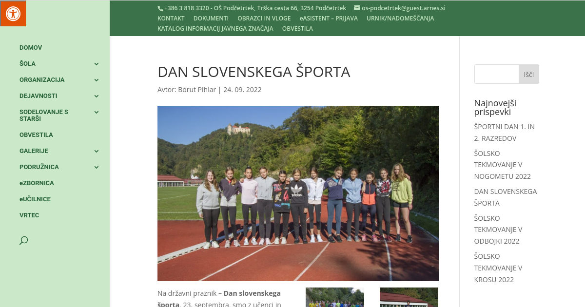 Na državni praznik – Dan slovenskega športa, 23. septembra, smo z učenci in učenkami od 6. do 9. razreda izvedli prvi športni dan v letošnjem šol. letu. V čudovitem jesenskem dnevu so se najprej pomerili v krosu, kasneje pa fantje še v nogometu in dekleta v odbojki. REZULTATI: KROS ODBOJKA NOGOMET