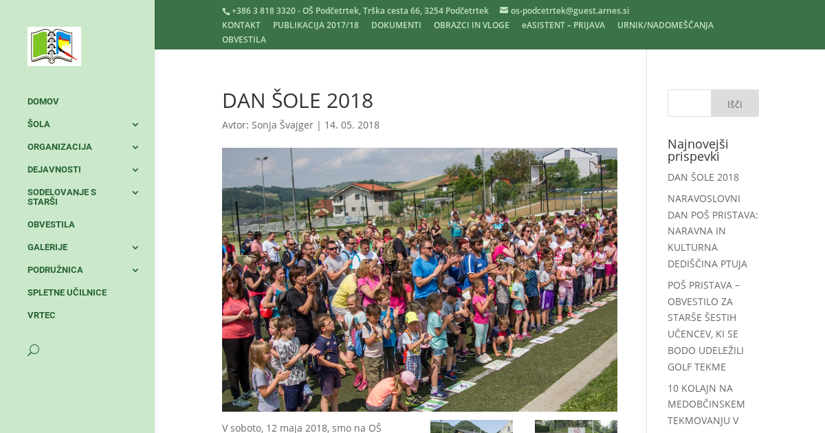V soboto, 12 maja 2018, smo na OŠ Podčetrtek praznovali dan šole. Zopet se je družilo več generacij in zopet smo izkoristili enkratne možnosti, ki jih imamo v okolici šole. Po urejenih kolesarskih stezah je v smereh proti Imenem, Rogaški Slatini in Šmarju pri Jelšah, kolesarilo skoraj 200 kolesarjev. Pohodniki so prepešačili pot do Podružnične šole v Pristavi pri Mestinju, kjer smo za vse udeležence organizirali toplo malico in kratek kulturni program. Prisotne sta pozdravila ravnateljica Sonja Švajger in župan občine Podčetrtek Peter Misja. Med pohodniki in kolesarji smo tudi izžrebali družini, ki sta prejeli praktični nagradi. Hvala staršem, lokalni skupnosti, PGD Pristava pri Mestinju in Termam Olimia, za pomoč pri organizaciji.