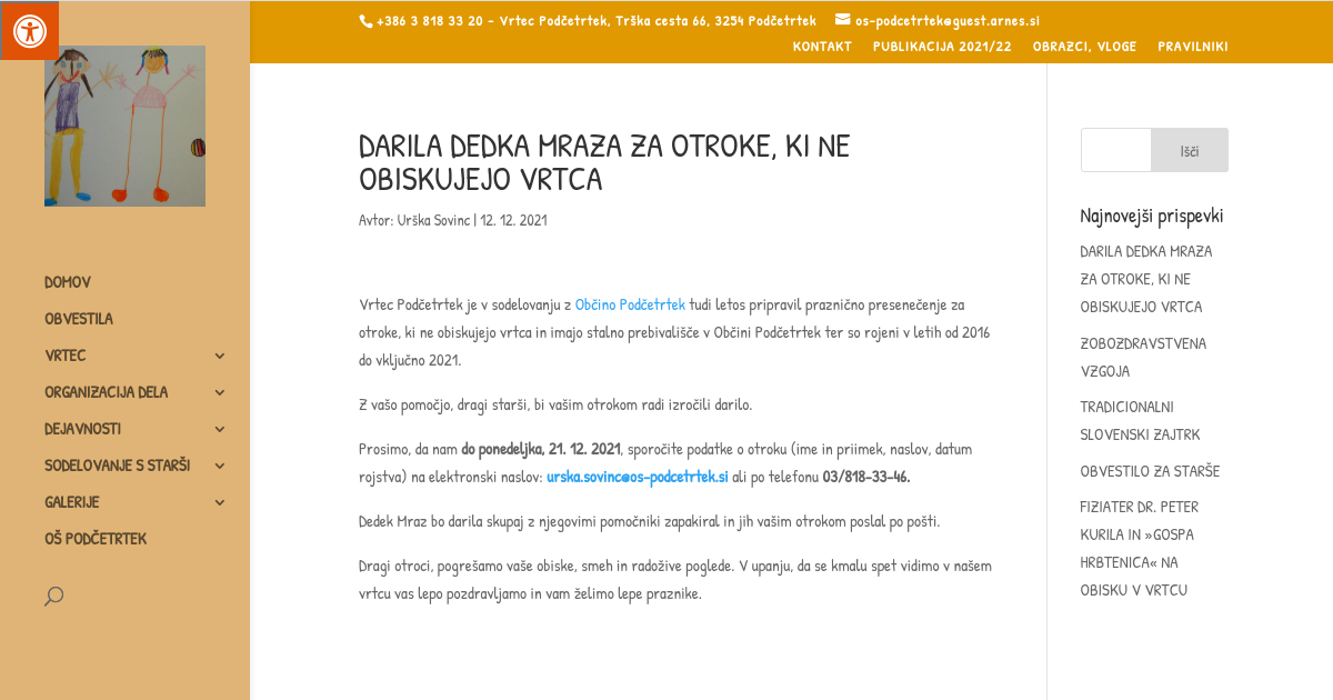 Vrtec Podčetrtek je v sodelovanju z Občino Podčetrtek tudi letos pripravil praznično presenečenje za otroke, ki ne obiskujejo vrtca in imajo stalno prebivališče v Občini Podčetrtek ter so rojeni v letih od 2016 do vključno 2021.