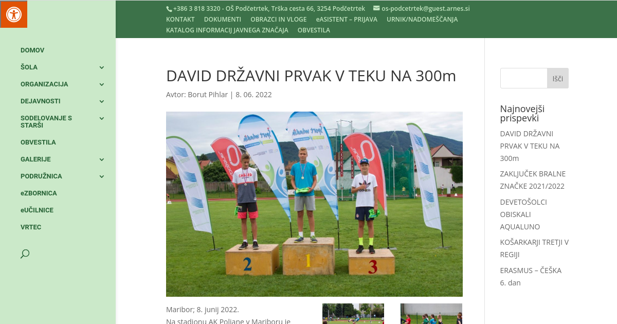 Maribor; 8. junij 2022. Na stadionu AK Poljane v Mariboru je potekalo letošnje državno tekmovanja v atletiki. V finale so se uvrstili tudi trije mladi atleti naše šole. Izjemen uspeh je dosegel David Jereb, ki je še enkrat več premagal vso konkurenco in postal državni prvak v teku na 300m za mlajše učence. Že tretjič zapored je izboljšal tudi šolski rekord, ki zdaj znaša izvrstnih 40,96. David je tako okronal svojo zelo uspešno športno leto in prepričljivo postal športnik šole za šol. leto 2021/2022. Športnica šole 2021/2022 pa je postala tudi Lara Košir, ki je na današnjem tekmovanju v skoku v višino za starejše učenke, le za en centimeter zaostala za osebnim in šolskim rekordom, ter zasedla 8. mesto v državi. Tretji član naše odprave pa je bil Nino Mlaker v skoku v višino za starejše učence, ki je kljub nekoliko slabši dnevni formi, dosegel lep uspeh že z samo uvrstitvijo na državno tekmovanje. Vsem trem ISKRENE ČESTITKE.