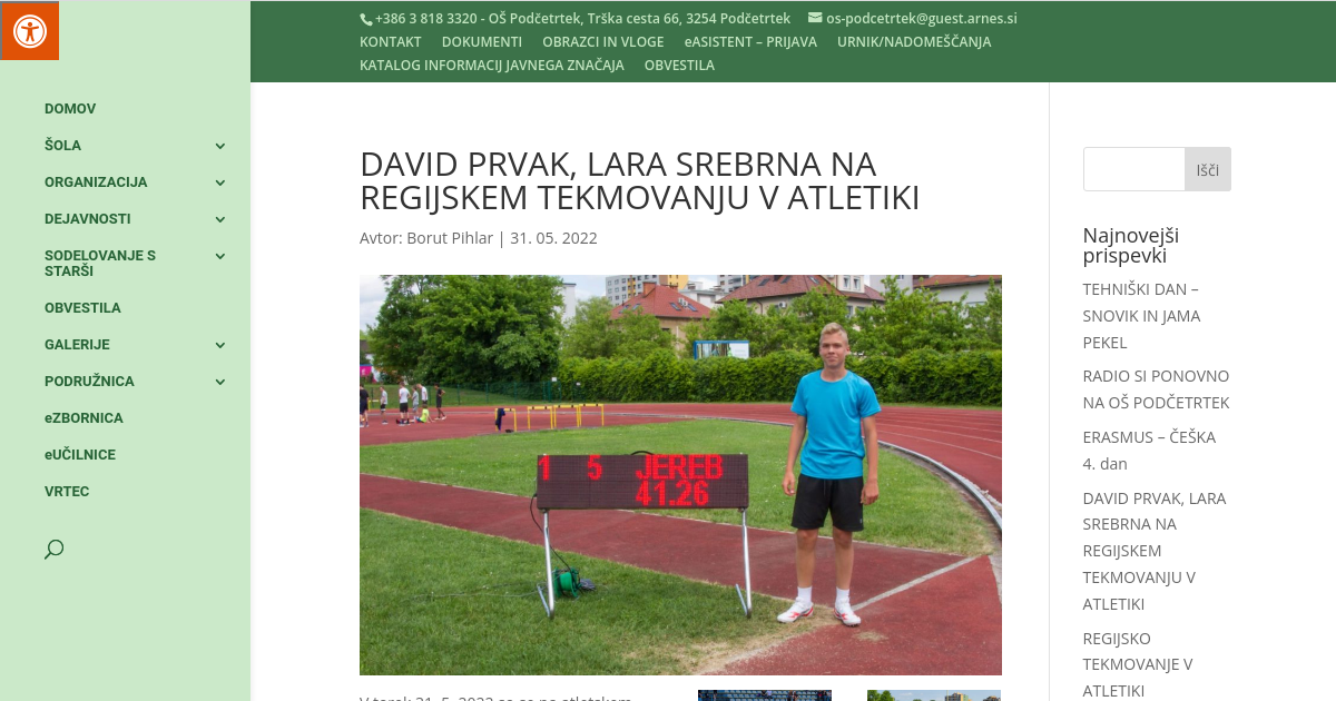 V torek 31. 5. 2022 so se na atletskem stadionu AK Kladivar v Celju zbrali najboljši mladi atleti celjske regije. Našo šolo je zastopalo 16 atletov in atletinj, ki so se ponovno odlično odrezali. David Jereb je z odličnim časom prepričljivo postal regijski prvak v teku na 300m med mlajšimi učenci, Lara Košir pa je osvojila drugo mesto v skoku v višino pri starejših učencih. Kmalu bodo znani tudi finalisti državnega tekmovanja, ki bo 8. 6. 2022 v Žalcu. Uvrstitve in rezultate današnjega tekmovanja si lahko pogledate na povezavi REZULTATI.
