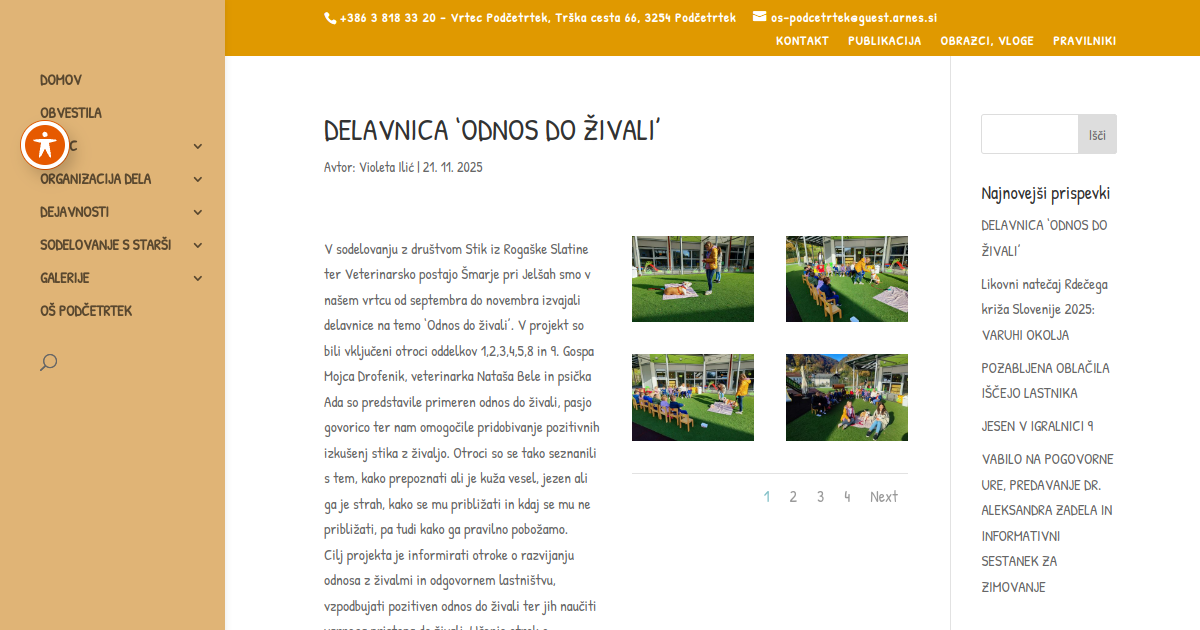 V sodelovanju z društvom Stik iz Rogaške Slatine ter Veterinarsko postajo Šmarje pri Jelšah smo v našem vrtcu od septembra do novembra izvajali delavnice na temo ‘Odnos do živali’. V projekt so bili vključeni otroci oddelkov 1,2,3,4,5,8 in 9. Gospa Mojca Drofenik, veterinarka Nataša Bele in psička Ada so predstavile primeren odnos do živali, pasjo govorico ter nam omogočile pridobivanje pozitivnih izkušenj stika z živaljo. Otroci so se tako seznanili s tem, kako prepoznati ali je kuža vesel, jezen ali ga je strah, kako se mu približati in kdaj se mu ne približati, pa tudi kako ga pravilno pobožamo. Cilj projekta je informirati otroke o razvijanju odnosa z živalmi in odgovornem lastništvu, vzpodbujati pozitiven odnos do živali ter jih naučiti varnega pristopa do živali. Učenje otrok o spoštovanju živali je namreč osnovni korak pri razvoju empatije, sočutja in občutka odgovornosti, saj temelji na razumevanju, da si vsa živa bitja zaslužijo da se z njimi ravna dostojanstveno. Ko se otroci učijo skrbeti za živali, jim privzgojimo občutek odgovornosti, ki predstavlja osnovo za prihodnje odgovornosti. Če otroke že zgodaj naučimo teh vrednot, pozitivno vplivamo na njihov moralni in čustveni razvoj – ne samo v interakciji z živalmi, ampak tudi z drugimi ljudmi.