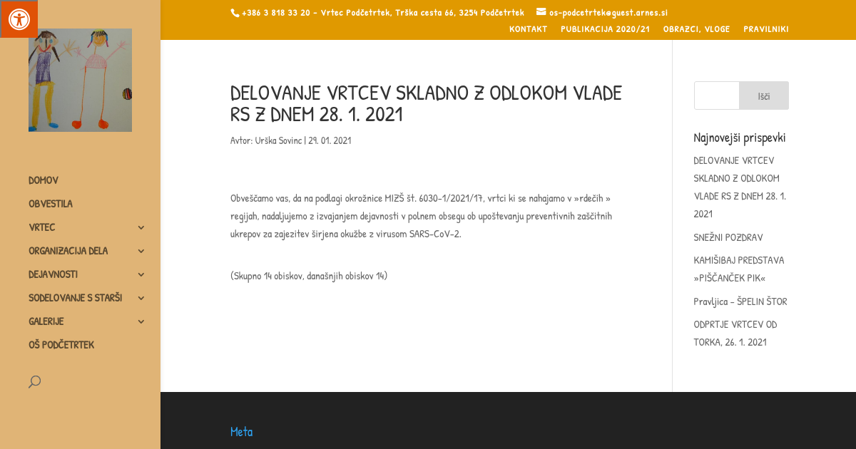 Obveščamo vas, da na podlagi okrožnice MIZŠ št. 6030-1/2021/17, vrtci ki se nahajamo v »rdečih » regijah, nadaljujemo z izvajanjem dejavnosti v polnem obsegu ob upoštevanju preventivnih zaščitnih ukrepov za zajezitev širjena okužbe z virusom SARS-CoV-2.