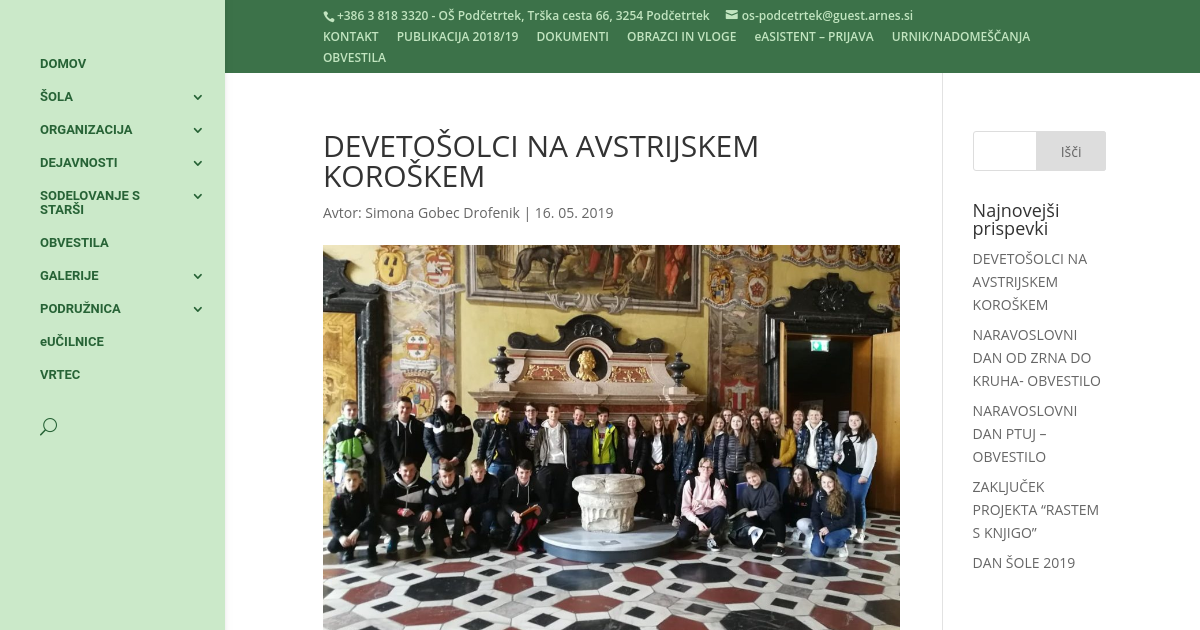 V torek, 14. maja, smo učenci devetih razredov obiskali avstrijsko Koroško. Odpravili smo se proti Celovcu, kjer smo obiskali deželno hišo in si tam ogledali knežji kamen. Nadaljevali smo z ogledom deželnega parlamenta. Potem smo šli v mesto in si ogledali več znamenitosti ter imeli malico. Po ogledu mesta smo odšli na grad. Do gradu smo se odpravili peš skozi 14 vrat. Obisk muzeja na gradu nas je navdušil. Videli smo viteško opremo, ki je tehtala od 25 do 40 kilogramov. Po ogledu smo imeli nekaj prostega časa in se nato odpravili proti avtobusu. Z njim smo se odpeljali do cerkve in si na poti do tja ogledali še Vojvodski prestol. Nato smo si šli ogledat Vrbsko jezero in za konec še Minimundus. V Minimundusu smo si lahko ogledali pomanjšane svetovno znane stavbe. Seveda smo naredili tudi nekaj fotografij in posnetkov. Zabavali smo se z različnimi igrami. Šli smo tudi v 4D kino, kjer je bilo zelo zabavno. V Minimundusu je Blaž Turk izvajal atrakcije z vodo. Seveda ni bil edini, ki je zganjal norčije. Ob 17.55 smo se zbrali pred vhodom Minimundusa. Tam smo dobili vse informacije o poti proti domu. Na poti domov smo se imeli lepo in se zabavali. Poslušali smo glasbo in peli kot nori. Ustavili smo se pri McDonald’su in se dobro najedli. Siti in izmučeni smo se odpeljali domov. Za deveti razred je bil to poseben dan. Naučili smo se veliko novega in se kot razred povezali. Ta ekskurzija je bila kot zaključni izlet, saj je to zadnji izlet, na katerega smo se odpravili kot deveti razred OŠ Podčetrtek.