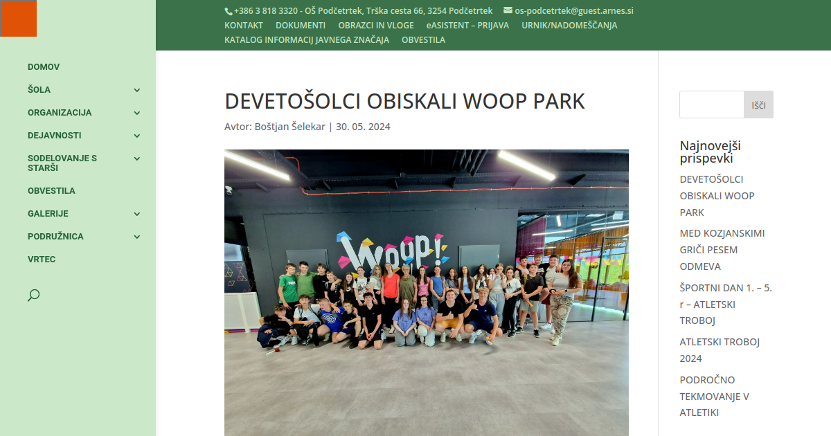 Z devetošolci smo za tokratni športni dan obiskali Woop park Maribor. Učenci so se preizkusili v skokih na tamkajšnjih atraktivnih trampolinih in odigrali igro navidezne resničnosti. Polni vtisov so se vrnili na šolo, kjer so še povadili plesni program za valeto in s tem zaokrožili pester, a hkrati tudi prijeten šolski dan.