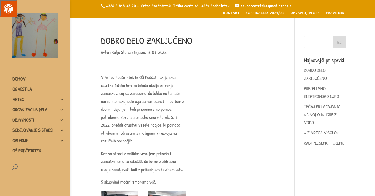 V Vrtcu Podčetrtek in OŠ Podčetrtek je skozi celotno šolsko leto potekala akcija zbiranja zamaškov, saj se zavedamo, da lahko na ta način naredimo nekaj dobrega za naš planet in ob tem z dobrim dejanjem tudi pripomoremo pomoči potrebnim. Zbrane zamaške smo v torek, 5. 7. 2022, predali društvu Vesele nogice, ki pomaga otrokom in odraslim z motnjami v razvoju na različnih področjih.