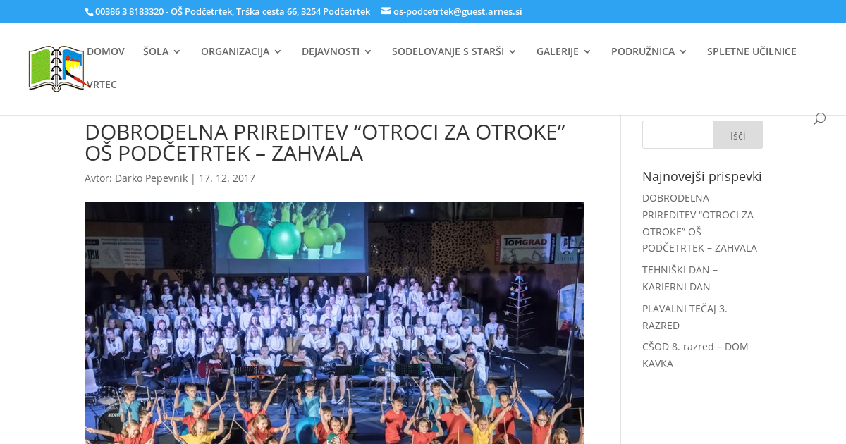 Prisrčno in iskreno se zahvaljujemo vsem, ki ste prireditev otroci za otroke OŠ Podčetrtek, obogatili s svojo prisotnostjo , s svojim nastopom, pomočjo ali donacijo. Še posebej hvala: staršem otrok OŠ Podčetrtek, Občini Podčetrtek, TIC-u Podčetrtek, Glasbeni šoli Rogaška Slatina, Knjižnici Šmarje pri Jelšah, časopisu OKO, RTV Slovenija, Katji Sinkovič, Gimnaziji Celje Center, Estet-u Kozje, Sazasu.