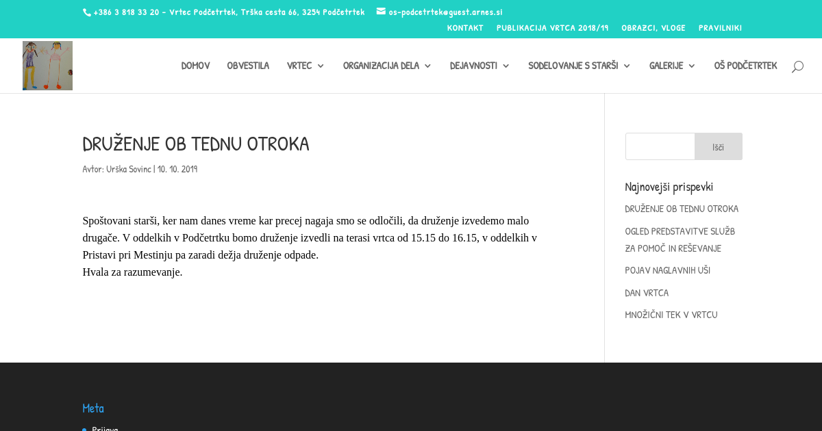 Spoštovani starši, ker nam danes vreme kar precej nagaja smo se odločili, da druženje izvedemo malo drugače. V oddelkih v Podčetrtku bomo druženje izvedli na terasi vrtca od 15.15 do 16.15, v oddelkih v Pristavi pri Mestinju pa zaradi dežja druženje odpade. Hvala za razumevanje.