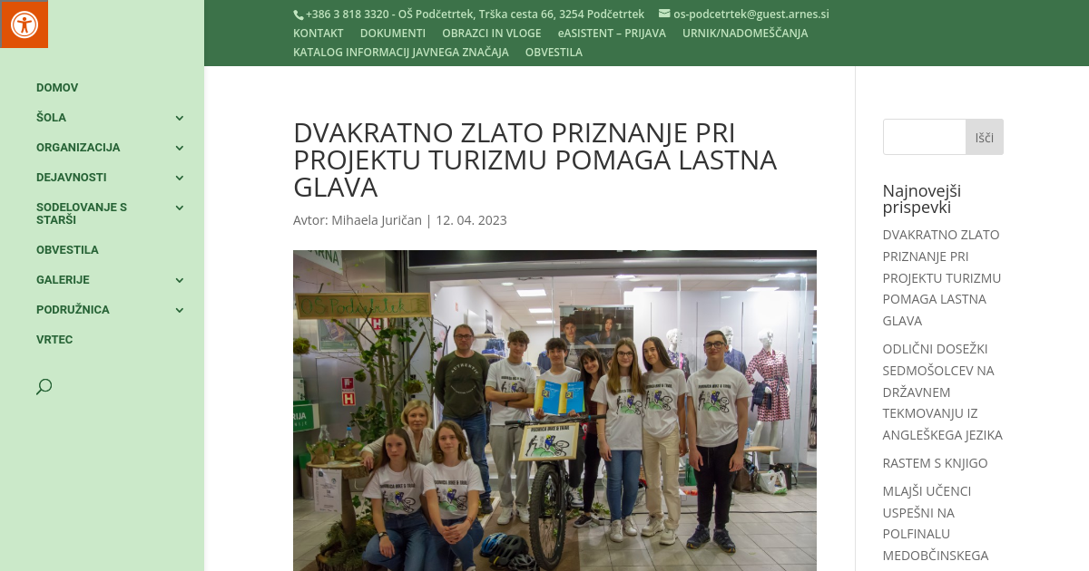 OŠ Podčetrtek je z ekipo učencev Turističnega krožka tudi v letošnjem letu sodelovala pri projektu Turistične zveze Slovenije Turizmu pomaga lastna glava. Tokratna tema projekta Športna doživetja bogatijo mladinski turizem jih je usmerjala v kreiranje športnega dogodka za mladino, ki so ga poimenovali Rudnica bike & trail. Ekipa devetošolcev Gaje Zupan in Filipa Guzeja ter osmošolk Julije Strašek, Lili Zupan in Teje Amon je pod mentorstvom učiteljic Simone Gobec Drofenik in Mihaele Juričan Šelekar ter sodelovanja devetošolcev Mauritsa Schmita in Žige Vračuna napisala seminarsko nalogo ter zasnovala turistično predstavitev, ki je poustvarila delček narave z naše okolice in virtualni spust z gorskim kolesom po rudniških strminah.