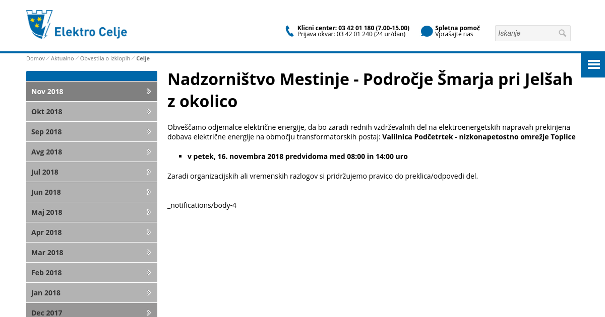 Obveščamo odjemalce električne energije, da bo zaradi rednih vzdrževalnih del na elektroenergetskih napravah prekinjena dobava električne energije na območju transformatorskih postaj: Valilnica Podčetrtek - nizkonapetostno omrežje Toplice v petek, 16. novembra 2018 predvidoma med 08:00 in 14:00 uro Zaradi organizacijskih ali vremenskih razlogov si pridržujemo pravico do preklica/odpovedi del.