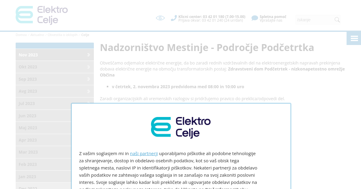 Obveščamo odjemalce električne energije, da bo zaradi rednih vzdrževalnih del na elektroenergetskih napravah prekinjena dobava električne energije na območju transformatorskih postaj: Zdravstveni dom Podčetrtek - nizkonapetostno omrežje Občina v četrtek, 2. novembra 2023 predvidoma med 08:00 in 10:00 uro Zaradi organizacijskih ali vremenskih razlogov si pridržujemo pravico do preklica/odpovedi del.