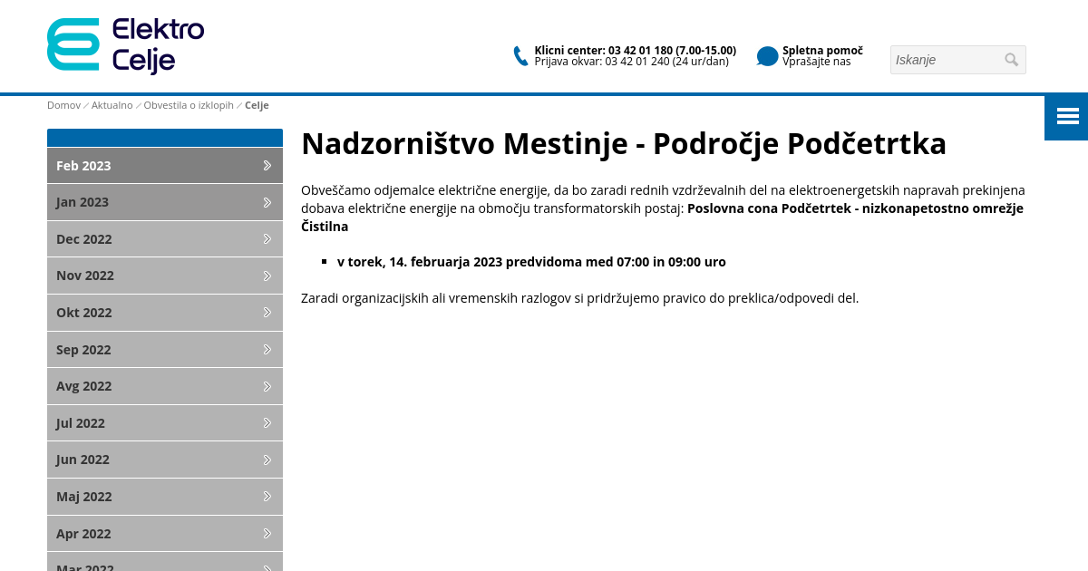 Obveščamo odjemalce električne energije, da bo zaradi rednih vzdrževalnih del na elektroenergetskih napravah prekinjena dobava električne energije na območju transformatorskih postaj: Poslovna cona Podčetrtek - nizkonapetostno omrežje Čistilna v torek, 14. februarja 2023 predvidoma med 07:00 in 09:00 uro Zaradi organizacijskih ali vremenskih razlogov si pridržujemo pravico do preklica/odpovedi del.