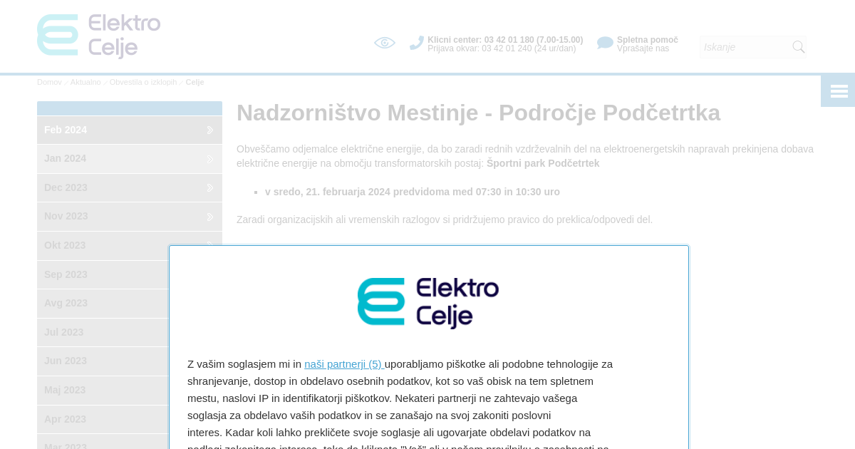 Obveščamo odjemalce električne energije, da bo zaradi rednih vzdrževalnih del na elektroenergetskih napravah prekinjena dobava električne energije na območju transformatorskih postaj: Športni park Podčetrtek v sredo, 21. februarja 2024 predvidoma med 07:30 in 10:30 uro Zaradi organizacijskih ali vremenskih razlogov si pridržujemo pravico do preklica/odpovedi del.