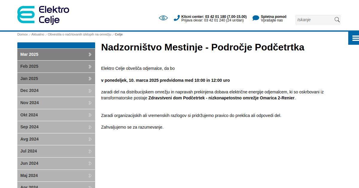 Elektro Celje obvešča odjemalce, da bo Zdravstveni dom Podčetrtek - nizkonapetostno omrežje Omarica 2-Renier v ponedeljek, 10. marca 2025 predvidoma med 10:00 in 12:00 urozaradi del na distribucijskem omrežju in napravah prekinjena dobava električne energije odjemalcem, ki so oskrbovani iz transformatorske postaje