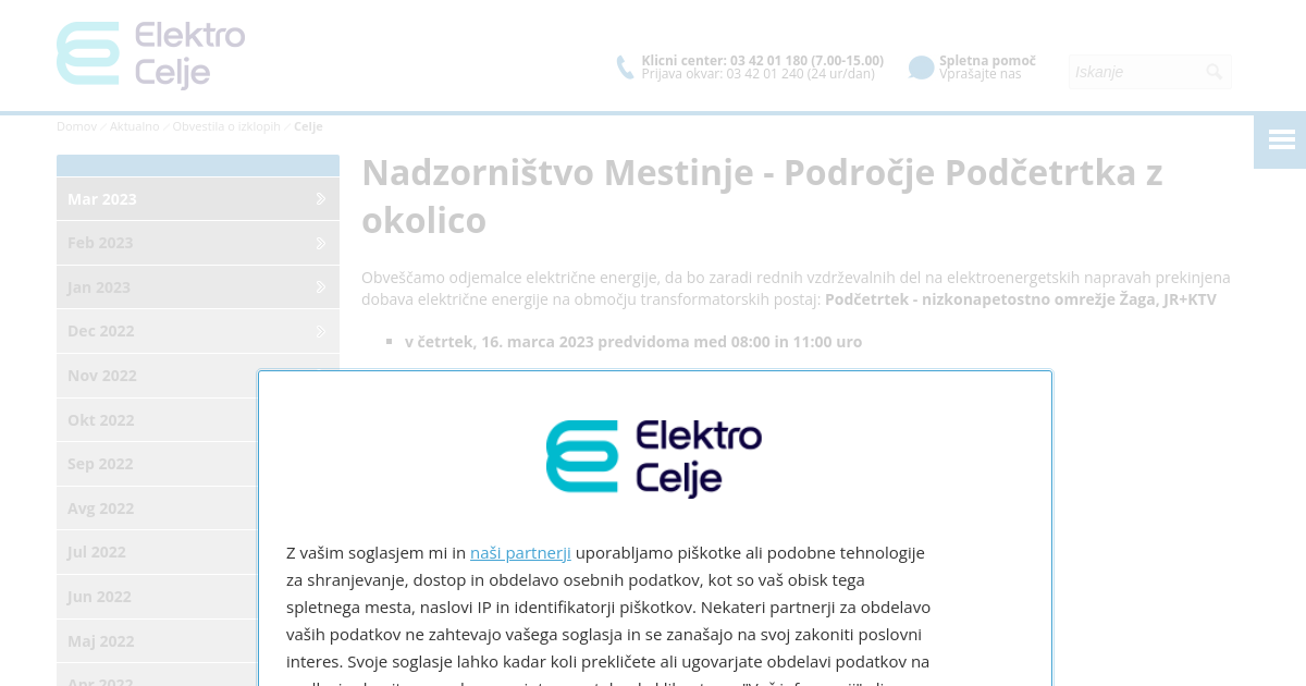 Obveščamo odjemalce električne energije, da bo zaradi rednih vzdrževalnih del na elektroenergetskih napravah prekinjena dobava električne energije na območju transformatorskih postaj: Podčetrtek - nizkonapetostno omrežje Žaga, JR+KTV v četrtek, 16. marca 2023 predvidoma med 08:00 in 11:00 uro Zaradi organizacijskih ali vremenskih razlogov si pridržujemo pravico do preklica/odpovedi del.