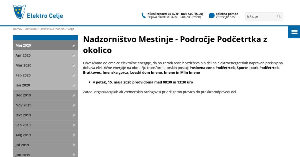 Obveščamo odjemalce električne energije, da bo zaradi rednih vzdrževalnih del na elektroenergetskih napravah prekinjena dobava električne energije na območju transformatorskih postaj: Poslovna cona Podčetrtek, Športni park Podčetrtek, Bratkovec, Imenska gorca, Lovski dom Imeno, Imeno in Mlin Imeno v petek, 15. maja 2020 predvidoma med 08:30 in 13:30 uro Zaradi organizacijskih ali vremenskih razlogov si pridržujemo pravico do preklica/odpovedi del.