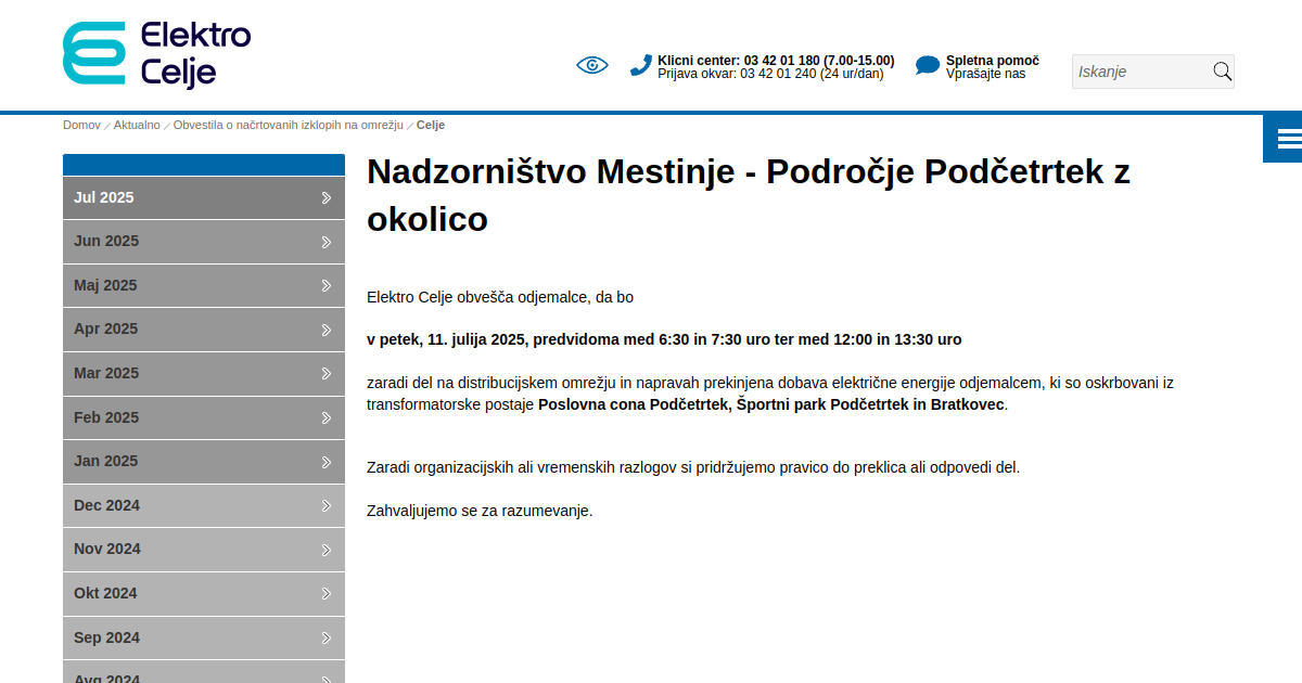 Elektro Celje obvešča odjemalce, da bo Poslovna cona Podčetrtek, Športni park Podčetrtek in Bratkovec v petek, 11. julija 2025, predvidoma med 6:30 in 7:30 uro ter med 12:00 in 13:30 urozaradi del na distribucijskem omrežju in napravah prekinjena dobava električne energije odjemalcem, ki so oskrbovani iz transformatorske postaje
