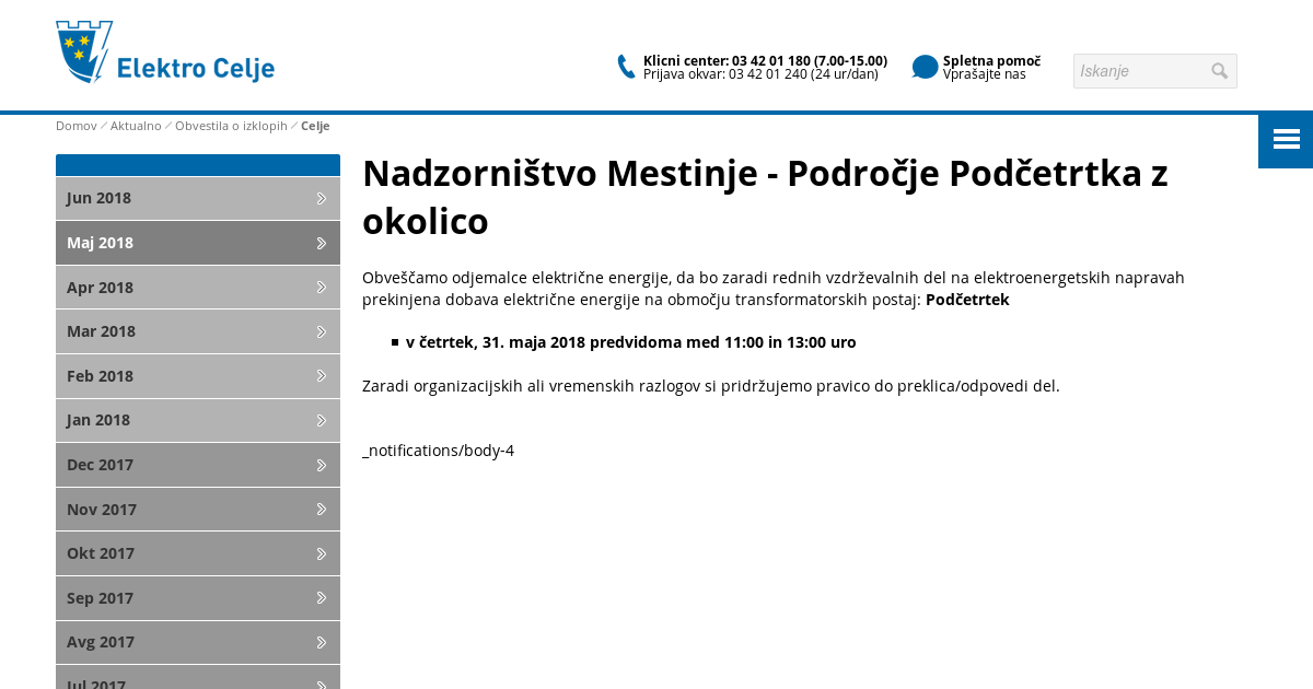 Obveščamo odjemalce električne energije, da bo zaradi rednih vzdrževalnih del na elektroenergetskih napravah prekinjena dobava električne energije na območju transformatorskih postaj: Podčetrtek v četrtek, 31. maja 2018 predvidoma med 11:00 in 13:00 uro Zaradi organizacijskih ali vremenskih razlogov si pridržujemo pravico do preklica/odpovedi del.