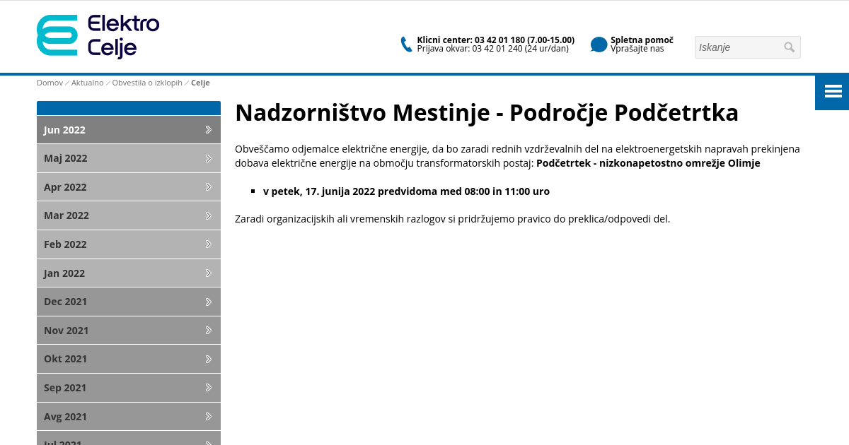 Obveščamo odjemalce električne energije, da bo zaradi rednih vzdrževalnih del na elektroenergetskih napravah prekinjena dobava električne energije na območju transformatorskih postaj: Podčetrtek - nizkonapetostno omrežje Olimje v petek, 17. junija 2022 predvidoma med 08:00 in 11:00 uro Zaradi organizacijskih ali vremenskih razlogov si pridržujemo pravico do preklica/odpovedi del.