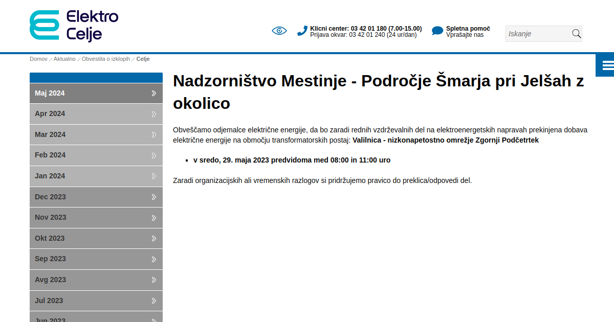 Obveščamo odjemalce električne energije, da bo zaradi rednih vzdrževalnih del na elektroenergetskih napravah prekinjena dobava električne energije na območju transformatorskih postaj: Valilnica - nizkonapetostno omrežje Zgornji Podčetrtek v sredo, 29. maja 2023 predvidoma med 08:00 in 11:00 uro Zaradi organizacijskih ali vremenskih razlogov si pridržujemo pravico do preklica/odpovedi del.