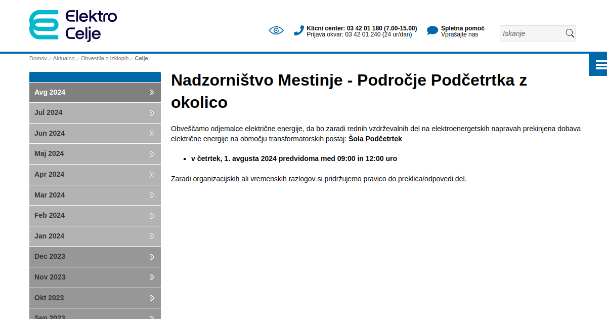 Obveščamo odjemalce električne energije, da bo zaradi rednih vzdrževalnih del na elektroenergetskih napravah prekinjena dobava električne energije na območju transformatorskih postaj: Šola Podčetrtek v četrtek, 1. avgusta 2024 predvidoma med 09:00 in 12:00 uro Zaradi organizacijskih ali vremenskih razlogov si pridržujemo pravico do preklica/odpovedi del.