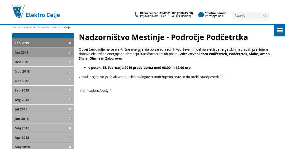 Obveščamo odjemalce električne energije, da bo zaradi rednih vzdrževalnih del na elektroenergetskih napravah prekinjena dobava električne energije na območju transformatorskih postaj: Zdravstveni dom Podčetrtek, Podčetrtek, Slake, Amon, Slivje, Olimje in Zaborovec v petek, 15. februarja 2019 predvidoma med 08:00 in 12:00 uro Zaradi organizacijskih ali vremenskih razlogov si pridržujemo pravico do preklica/odpovedi del.