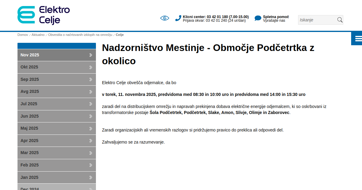 Elektro Celje obvešča odjemalce, da bo Šola Podčetrtek, Podčetrtek, Slake, Amon, Slivje, Olimje in Zaborovec v torek, 11. novembra 2025, predvidoma med 08:30 in 10:00 uro in predvidoma med 14:00 in 15:30 urozaradi del na distribucijskem omrežju in napravah prekinjena dobava električne energije odjemalcem, ki so oskrbovani iz transformatorske postaje