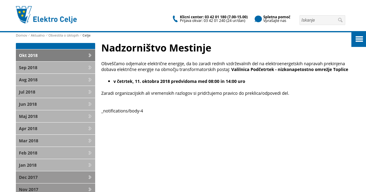 Obveščamo odjemalce električne energije, da bo zaradi rednih vzdrževalnih del na elektroenergetskih napravah prekinjena dobava električne energije na območju transformatorskih postaj: Valilnica Podčetrtek - nizkonapetostno omrežje Toplice v četrtek, 11. oktobra 2018 predvidoma med 08:00 in 14:00 uro Zaradi organizacijskih ali vremenskih razlogov si pridržujemo pravico do preklica/odpovedi del.