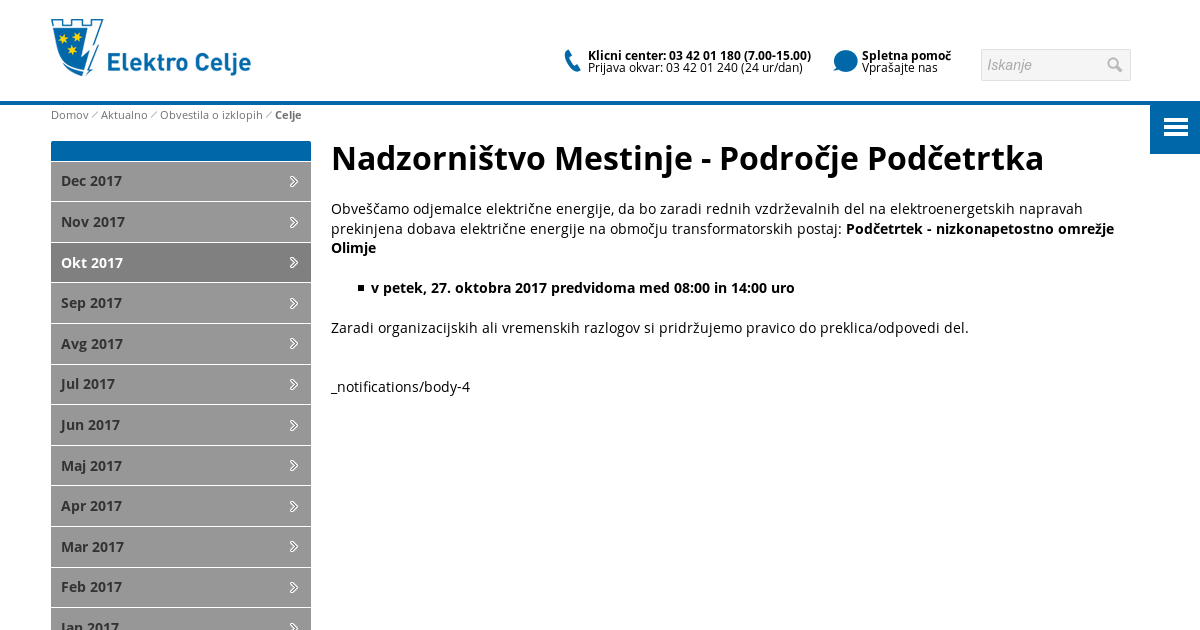 Obveščamo odjemalce električne energije, da bo zaradi rednih vzdrževalnih del na elektroenergetskih napravah prekinjena dobava električne energije na območju transformatorskih postaj: Podčetrtek - nizkonapetostno omrežje Olimje v petek, 27. oktobra 2017 predvidoma med 08:00 in 14:00 uro Zaradi organizacijskih ali vremenskih razlogov si pridržujemo pravico do preklica/odpovedi del.