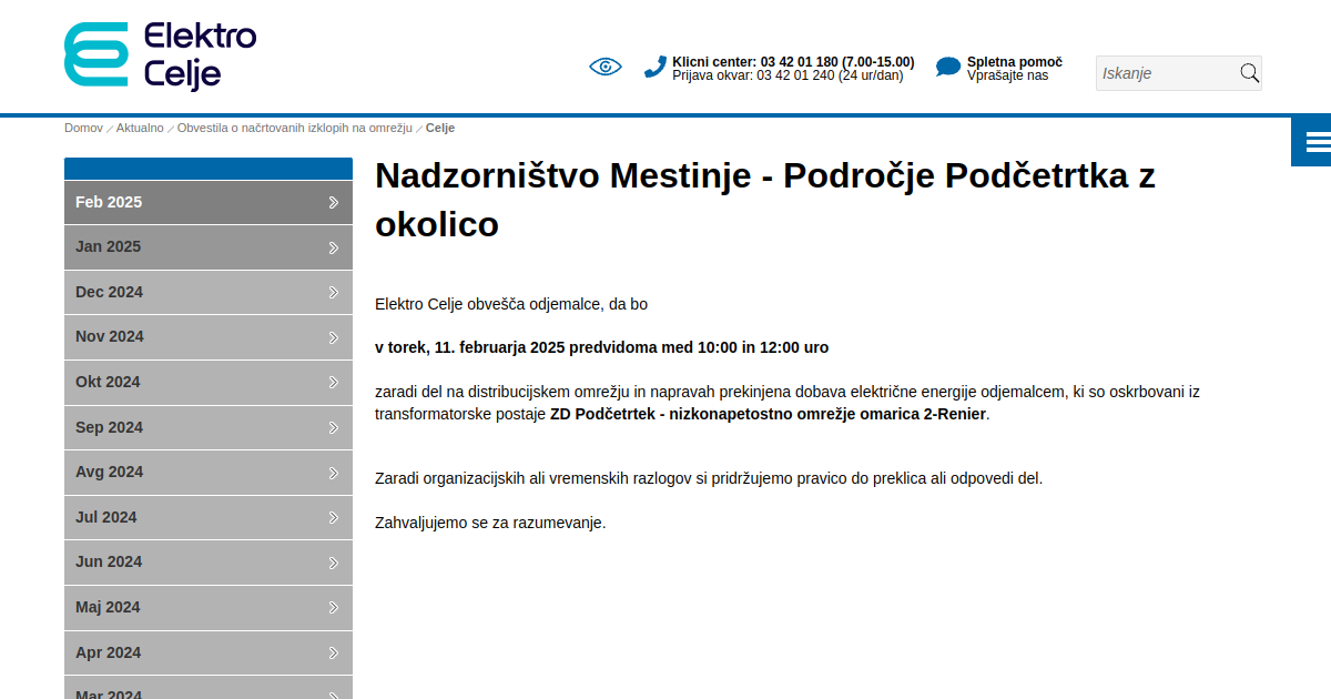 Elektro Celje obvešča odjemalce, da bo ZD Podčetrtek - nizkonapetostno omrežje omarica 2-Renier v torek, 11. februarja 2025 predvidoma med 10:00 in 12:00 urozaradi del na distribucijskem omrežju in napravah prekinjena dobava električne energije odjemalcem, ki so oskrbovani iz transformatorske postaje