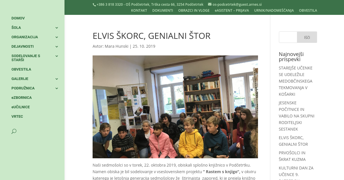 Naši sedmošolci so v torek, 22. oktobra 2019, obiskali splošno knjižnico v Podčetrtku. Namen obiska je bil sodelovanje v vseslovenskem projektu ” Rastem s knjigo”, v okviru katerega je letošnja generacija sedmošolcev že štirinajsta zapored, ki je prejela knjižno nagrado. Tokrat je to knjiga mladinske pisateljice Janje Vidmar, Elvis Škorc, genialni štor. Sicer pa so učenci zvedeli tudi veliko o poslanstvu knjižnice in knjižnic nasploh, dobili nekaj zelo uporabnih tehnološko naprednih informacij kot člani splošne knjižnice Šmarje pri Jelšah in si ogledali kratek film o genialnem štoru. Le ta bi znal biti zelo pozitivna vzpodbuda za branje knjige in nadaljnje aktivnosti v projektu.