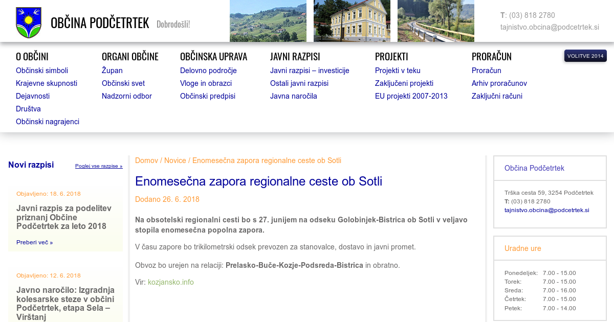 Na obsotelski regionalni cesti bo s 27. junijem na odseku Golobinjek-Bistrica ob Sotli v veljavo stopila enomesečna popolna zapora. V času zapore bo trikilometrski odsek prevozen za stanovalce, dostavo in javni promet. Obvoz bo urejen na relaciji: Prelasko-Buče-Kozje-Podsreda-Bistrica in obratno. Vir: kozjansko.info