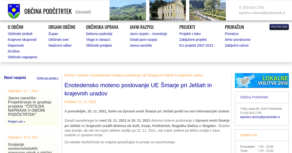 V ponedeljek, 15. 11. 2021, bodo na Upravni enoti Šmarje pri Jelšah prešli na nov informacijski sistem.  Zaradi navedenega bo med 15. 11. 2021 in 19. 11. 2021 deloma moteno poslovanje v Upravni enoti Šmarje pri Jelšah ter krajevnih uradih Bistrica ob Sotli, Kozje, Podčetrtek, Rogaška Slatina in Rogatec. Stranke zato prosijo, da vse ne-nujne zadeve uredijo po 22. 11. 2021, vse