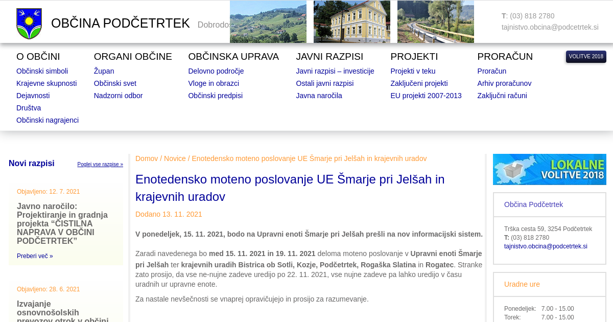 V ponedeljek, 15. 11. 2021, bodo na Upravni enoti Šmarje pri Jelšah prešli na nov informacijski sistem. Zaradi navedenega bo med 15. 11. 2021 in 19. 11. 2021 deloma moteno poslovanje v Upravni enoti Šmarje pri Jelšah ter krajevnih uradih Bistrica ob Sotli, Kozje, Podčetrtek, Rogaška Slatina in Rogatec. Stranke zato prosijo, da vse ne-nujne zadeve uredijo po 22. 11. 2021, vse