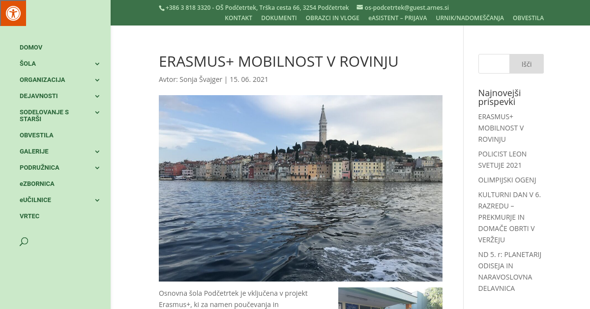 Osnovna šola Podčetrtek je vključena v projekt Erasmus+, ki za namen poučevanja in usposabljanja omogoča strokovnim delavcem, da v tujini preživijo nekaj časa in si razširijo obzorje. Koordinatorica projekta je Anita Skerbiš. Glede na razmere je bilo v letošnjem šolskem letu vse skupaj malce oteženo in je bila mobilnost učiteljev skozi celotno šolsko leto onemogočena. Zaradi izboljšanja epidemiološke situacije smo bili v okviru projekta Erasmus+ “Job shadowing – Izzivi inkluzije” v obdobju 6. – 12. 6 2021 povabljeni na mobilnost v Osnovno šolo Jurja Dobrile v Rovinju na Hrvaškem, katero obiskuje 650 učencev. Mobilnosti sva se udeležili ravnateljica Sonja Švajger in svetovalna delavka vrtca Katja Starček Erjavec. Skozi celoten teden smo ob upoštevanju priporočil NIJZ na zunanjem šolskem prostoru izvedli številna srečanja z ravnateljem, koordinatorji projektov in učitelji, kjer smo si izmenjali številne metode podajanja in načine ocenjevanja znanja v času pouka v šoli in na daljavo. Izmenjali smo znanja o uporabi IKT orodja in opazovali številne načine izvedb pouka v naravi. Koordinatorji projekta so nama omogočili strukturirane obiske šole, podružnic in vrtca. Predstavili so nama številne primere dobrih praks v poučevanju, nove učne metode, katere bova prenesli med sodelavce. Seznanili sva se z delovanjem svetovalne službe in organizacijo dela z otroki s posebnimi potrebami Še posebej naju je zanimalo opazovanje inovativnih metod poučevanja, kot so projektno učenje in obšolske dejavnosti, ki spodbujajo ustvarjalnost in odličnost učencev. Obiskali sva podružnici osnovne šole v Rovinjskem Selu in naselju Bale ter Otroški vrtec Neven. V 7. razredu sva izvedli predstavitev Slovenije, Občine Podčetrtek, naše šole in šolskega sistema v Sloveniji.