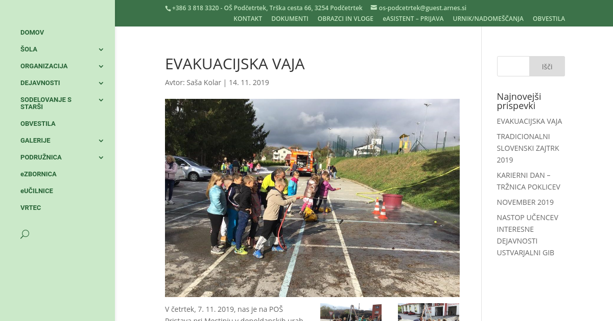 V četrtek, 7. 11. 2019, nas je na POŠ Pristava pri Mestinju v dopoldanskih urah presenetil dim, ki je naznanjal evakuacijo. Učenci, otroci iz vrtca in vsi zaposleni smo poskušali v čim krajšem času zapustiti šolske prostore in se zbrati na zbirnem mestu na igrišču. Pozdravila sta nas poveljnik PGD Pristava pri Mestinju, gospod Darko Guzej in Stanko Drofenik, ki sta nam podala kar nekaj koristnih informacij v zvezi z evakuacijo. V manjših skupinah smo se nato odpravili na parkirišče, kjer so imeli prostovoljni gasilci za učence pripravljene štiri zanimive postaje, skozi katere so najmlajši spoznali, kako raznoliko je delo gasilcev. Polni čudovitih vtisov in novih izkušenj smo se nato odpravili v gasilske prostore, kjer nas je čakalo sladko presenečenje.