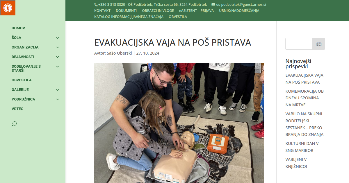 Še pred jesenskimi počitnicami smo na podružnični šoli Pristava v sodelovanju s PGD Pristava izvedli evakuacijsko vajo. Ta je na naši šoli je namenjena pripravi učencev, učiteljev in drugih zaposlenih na morebitne izredne dogodke, kot so požar, potres ali druge nevarnosti. Vaja je načrtovana tako, da nas nauči pravilnega in hitrega odziva v primeru nevarnosti ter zagotovi, da vsakdo pozna varne poti in mesta zbiranja izven šole.
