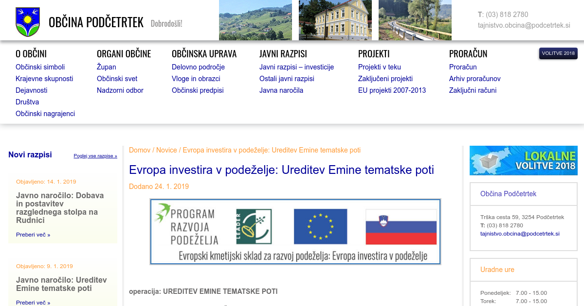 operacija: UREDITEV EMINE TEMATSKE POTI akronim operacije: EMINA DOŽIVETJA Občina Podčetrtek kot prijavitelj operacije »Emina tematska pot« kandidira za pridobitev sofinanciranja na 2. Javnem pozivu za izbor operacij v okviru strategije lokalnega razvoja, ki ga vodi skupnost za izvajanje Strategije lokalnega razvoja LAS Obsotelje in Kozjansko v programskem obdobju 2014 – 2020, sofinancirane iz