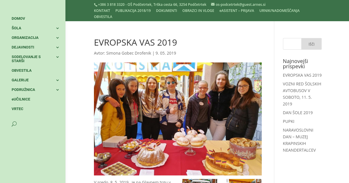 V sredo, 8. 5. 2019, je na Glavnem trgu v Celju, potekal zaključek projekta Evropska vas 2019. Na sklepni slovesnosti je sodelovalo 34 ustanov (šole, vrtci, zavodi…), ki so na stojnice in oder prinesli najboljše, kar Evropska unija ponuja. Letos se je projektu pridružila tudi naša šola. Učenci izbirnega predmeta Nemščina so letos podrobneje spoznavali državo Nemčijo. Posebej jih je pritegnilo nemško glavno mesto Berlin. V okviru projekta so pripravili atraktivno stojnico z Berlinskim zidom in znamenitim kombijem WV T1. Ker gre spoznavanje boljše skozi želodec, so pripravili tudi nekaj tipičnih berlinskih sladic (Marmorkuchen, Gugelhupf, Käsekuchen in Schweinohren). Svojo predstavitev so nadgradili še pesmijo Ein bisschen Frieden, ki jo je pevka Nicole zapela na evrovizijskem odru daljnega leta 1982.