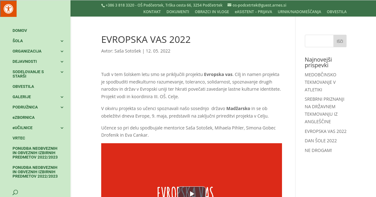 Tudi v tem šolskem letu smo se priključili projektu Evropska vas. Cilj in namen projekta je spodbuditi medkulturno razumevanje, toleranco, solidarnost, spoznavanje drugih narodov in držav v Evropski uniji ter hkrati povečati zavedanje lastne kulturne identitete. Projekt vodi in koordinira III. OŠ. Celje.