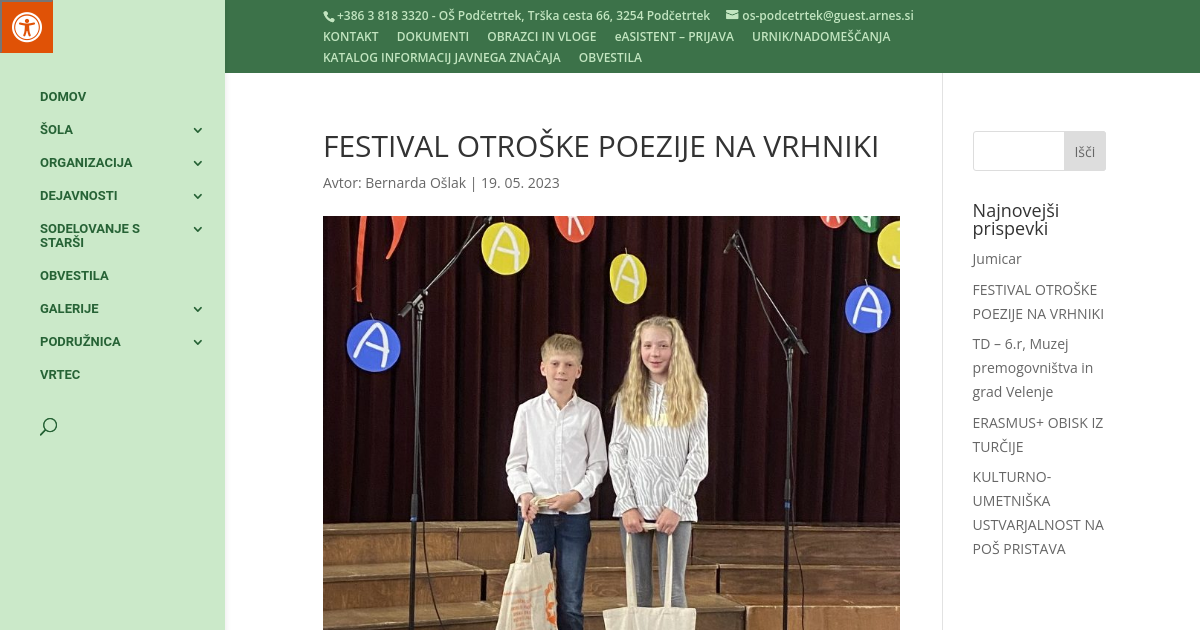 V sredo, 17. 5. 2023, je na Vrhniki potekala zaključna prireditev natečaja Rima raja – festivala otroške poezije. Med izbrane finaliste sta se s svojima pesmima uvrstila tudi učenca naše šole, in sicer Mark Debelak (5. r.) in Iva Mrkša (6. r.). Na prireditvi v veliki dvorani Kulturnega doma Ivana Cankarja na Vrhniki sta se predstavila z umetniško interpretacijo svoje poezije in prejela diplomi za mladega pesnika in pesnico.
