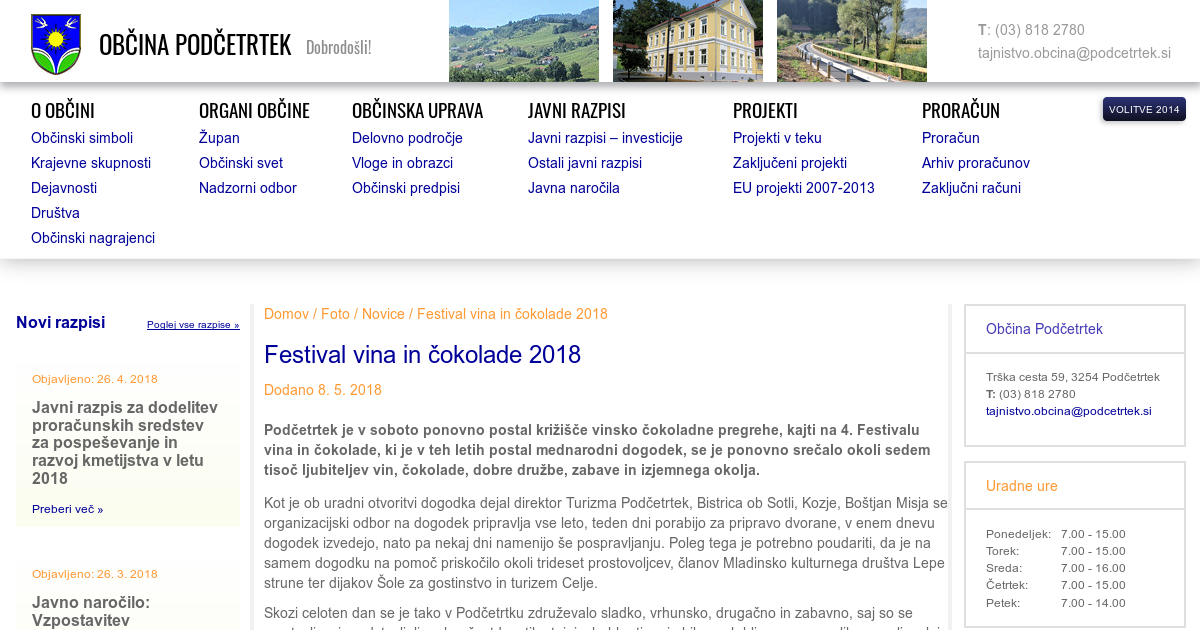 Podčetrtek je v soboto ponovno postal križišče vinsko čokoladne pregrehe, kajti na 4. Festivalu vina in čokolade, ki je v teh letih postal mednarodni dogodek, se je ponovno srečalo okoli sedem tisoč ljubiteljev vin, čokolade, dobre družbe, zabave in izjemnega okolja. Kot je ob uradni otvoritvi dogodka dejal direktor Turizma Podčetrtek, Bistrica ob Sotli, Kozje, Boštjan Misja
