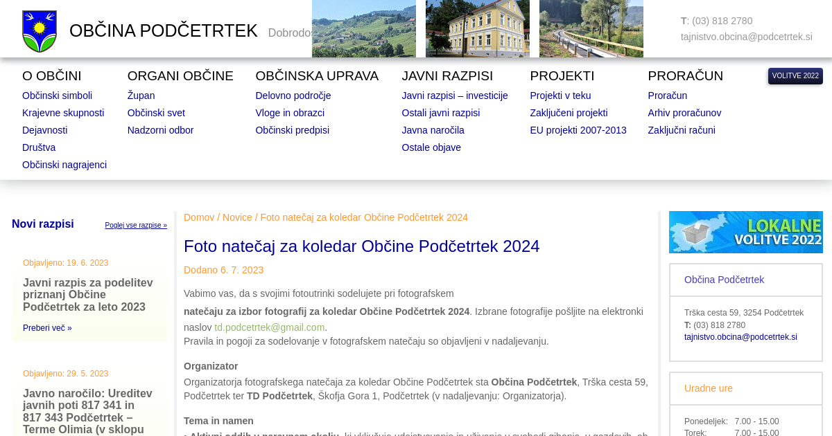 Vabimo vas, da s svojimi fotoutrinki sodelujete pri fotografskem natečaju za izbor fotografij za koledar Občine Podčetrtek 2024. Izbrane fotografije pošljite na elektronki naslov td.podcetrtek@gmail.com. Pravila in pogoji za sodelovanje v fotografskem natečaju so objavljeni v nadaljevanju. Organizator Organizatorja fotografskega natečaja za koledar Občine Podčetrtek sta Občina Podčetrtek, Trška cesta 59, Podčetrtek ter TD Podčetrtek, Škofja