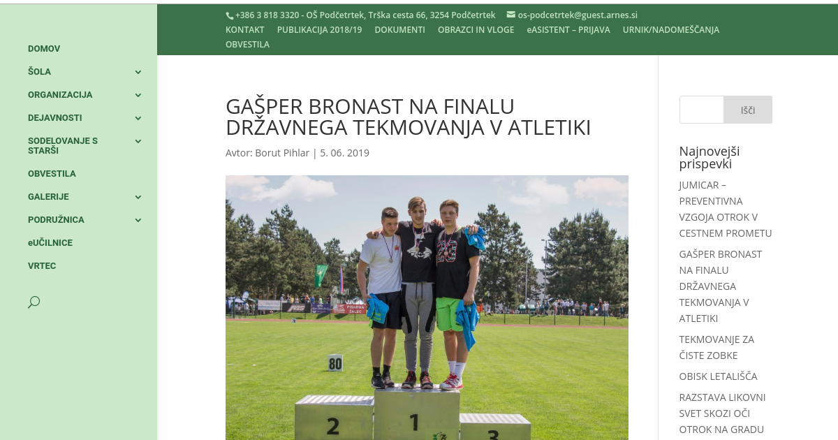 V sredo, 5. junija, je v Žalcu potekalo finale državnega tekmovanja v atletiki. Skozi sito šolskih, medobčinskih in področnih tekmovanj se je na finale uvrstil tudi Gašper Škorjanc. V suvanju krogle je še izboljšal svoj osebni rekord in z rezultatom 12,95 m osvojil tretje mesto ter bronasto kolajno. Samo nekaj centimetrov je zaostal za šolskim rekordom, ki tako še naprej ostaja v lasti njegovega brata Florijana. Gašper je tako samo še potrdil naziv najboljšega športnika šole v šol. letu 2018/2019. Čestitke.