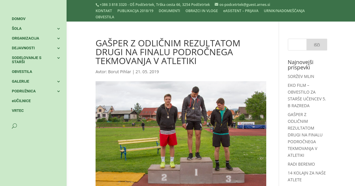 V ponedeljek 20. maja je v Celju na stadionu AK Kladivar potekalo finale področnega tekmovanja v atletiki. V finale se je uvrstilo tudi 18 naših atletov in atletinj, ter obe štafeti 4x100M. Najboljšo uvrstitev je z odličnim rezultatom 12,70 m dosegel Gašper Škorjanc, ki je osvojil srebrno medaljo v suvanju krogle za starejše učence, izboljšanih pa je bilo tudi nekaj osebnih rekordov.