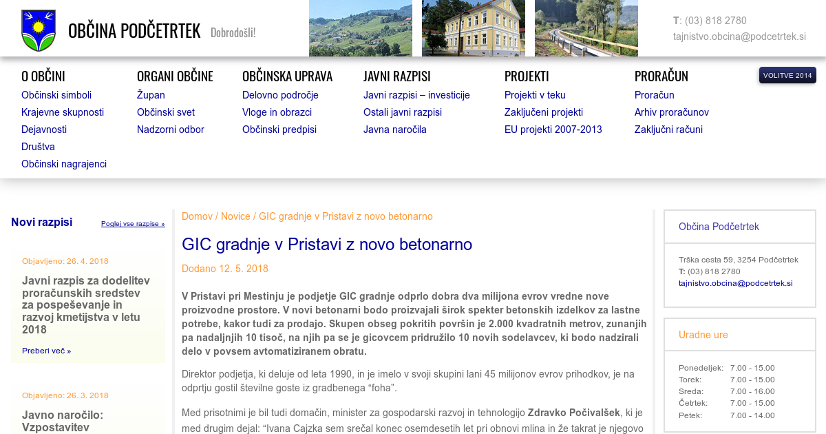 V Pristavi pri Mestinju je podjetje GIC gradnje odprlo dobra dva milijona evrov vredne nove proizvodne prostore. V novi betonarni bodo proizvajali širok spekter betonskih izdelkov za lastne potrebe, kakor tudi za prodajo. Skupen obseg pokritih površin je 2.000 kvadratnih metrov, zunanjih pa nadaljnjih 10 tisoč, na njih pa se je gicovcem pridružilo 10 novih sodelavcev,