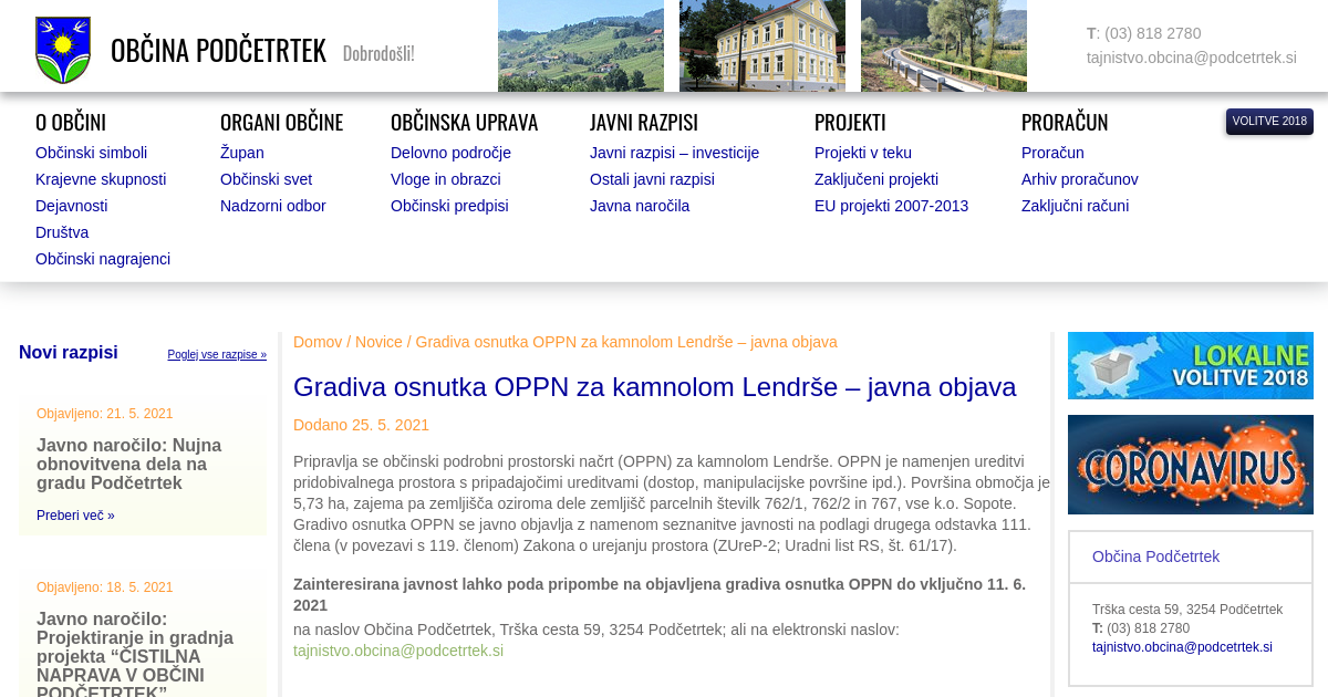 Pripravlja se občinski podrobni prostorski načrt (OPPN) za kamnolom Lendrše. OPPN je namenjen ureditvi pridobivalnega prostora s pripadajočimi ureditvami (dostop, manipulacijske površine ipd.). Površina območja je 5,73 ha, zajema pa zemljišča oziroma dele zemljišč parcelnih številk 762/1, 762/2 in 767, vse k.o. Sopote. Gradivo osnutka OPPN se javno objavlja z namenom seznanitve javnosti na podlagi