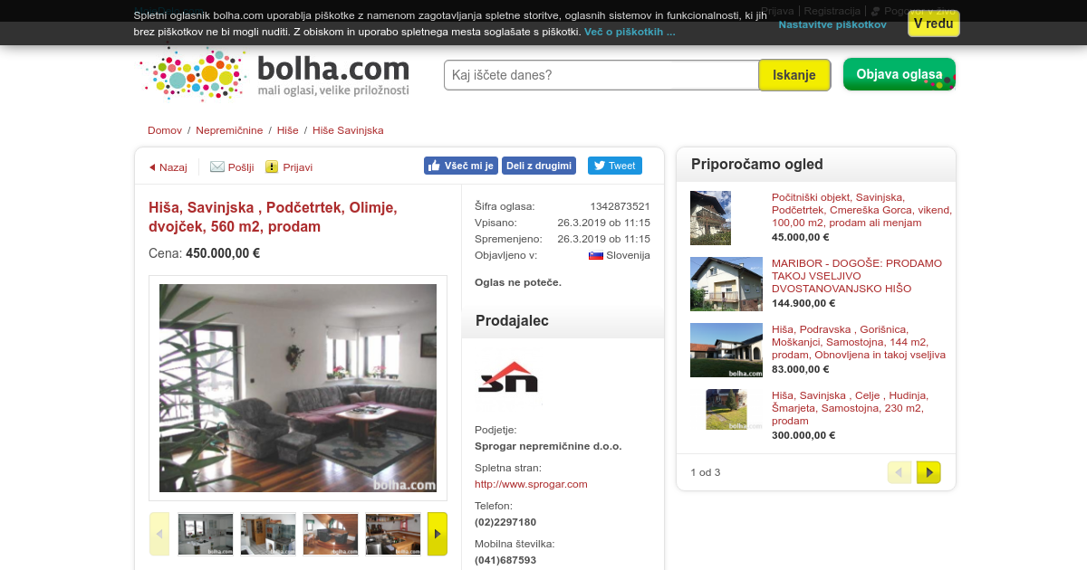 Kraj/naselje: Olimje Tip:dvojček Velikost: 560, 00 m2 Velikost parcele: 5033, 00 m2 Leto izgradnje: 1995