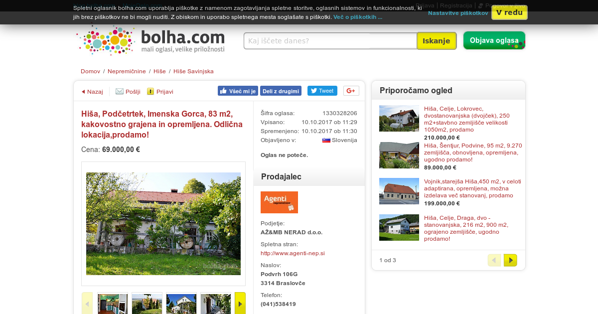 Kraj/naselje: Imenska Gorca Tip:samostojna Velikost: 83, 00 m2 Velikost parcele: 2625, 00 m2 Leto izgradnje: 1976 Zadnja adaptacija: 2004